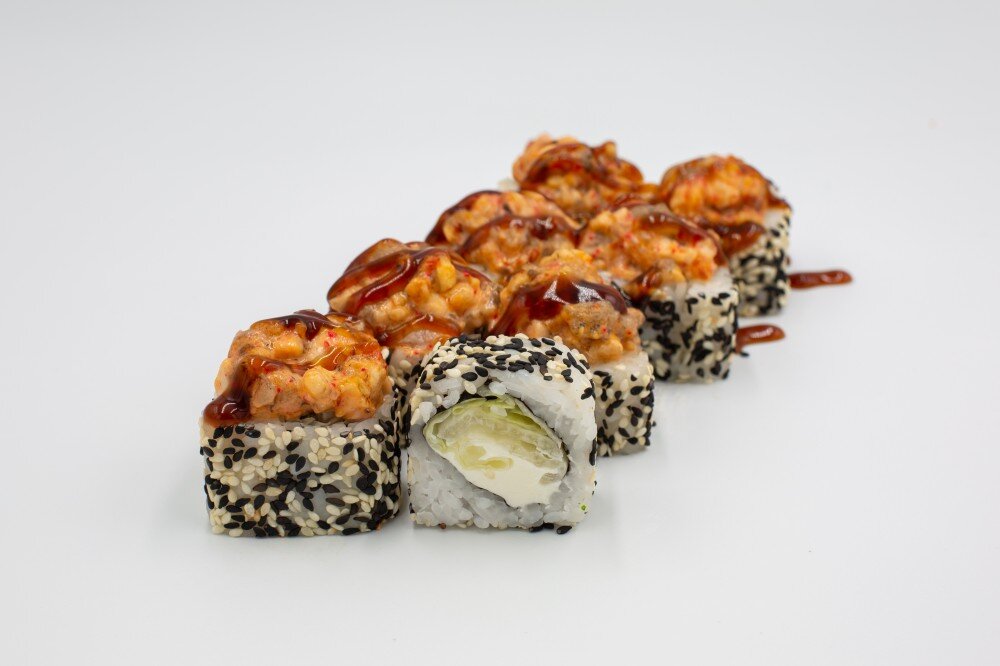 Рис, Нори, Угорь, Кунжут, Крем Сыр, Салат Айсберг, Спайси Соус, Унаги Соус, Лава Соус