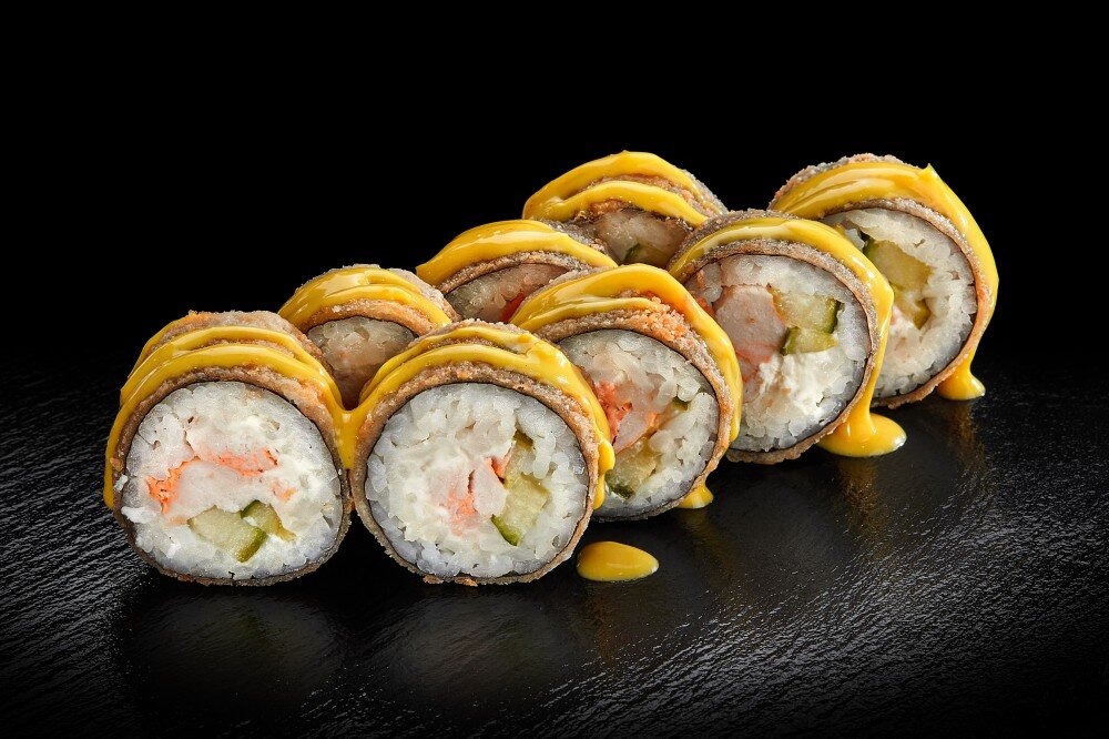 Рис, Нори, Куриное Филе Отварное, Крем Сыр, Огурец , Сухари Панко, Кляр, Соус Карри