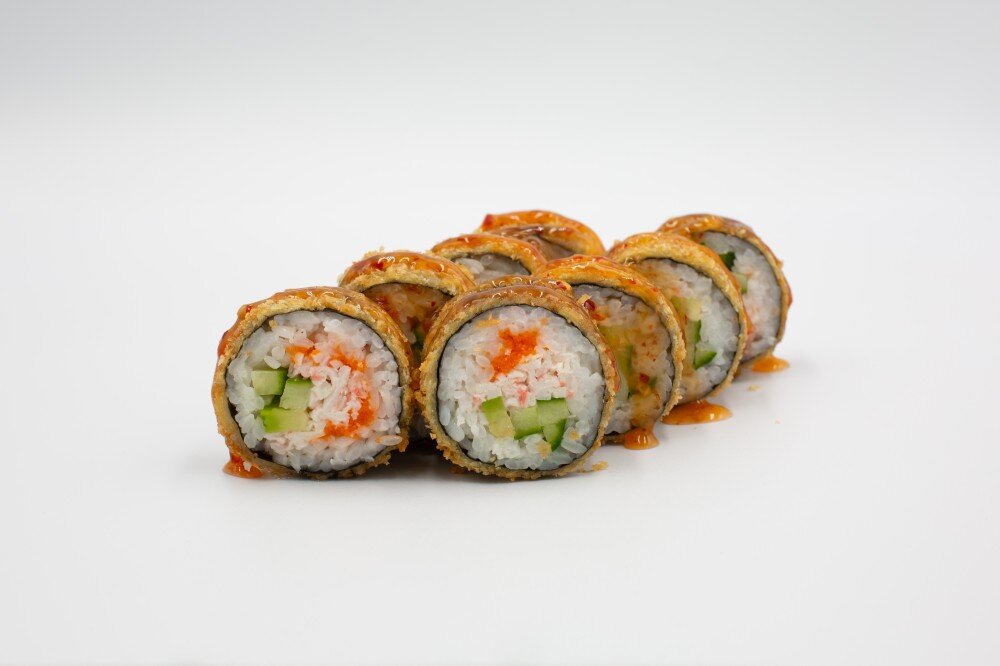 Рис, Нори, Краб Микс, Икра Масаго, Огурец, Авокадо, Кляр, Сухари Панко, Сладкий Соус Чили
