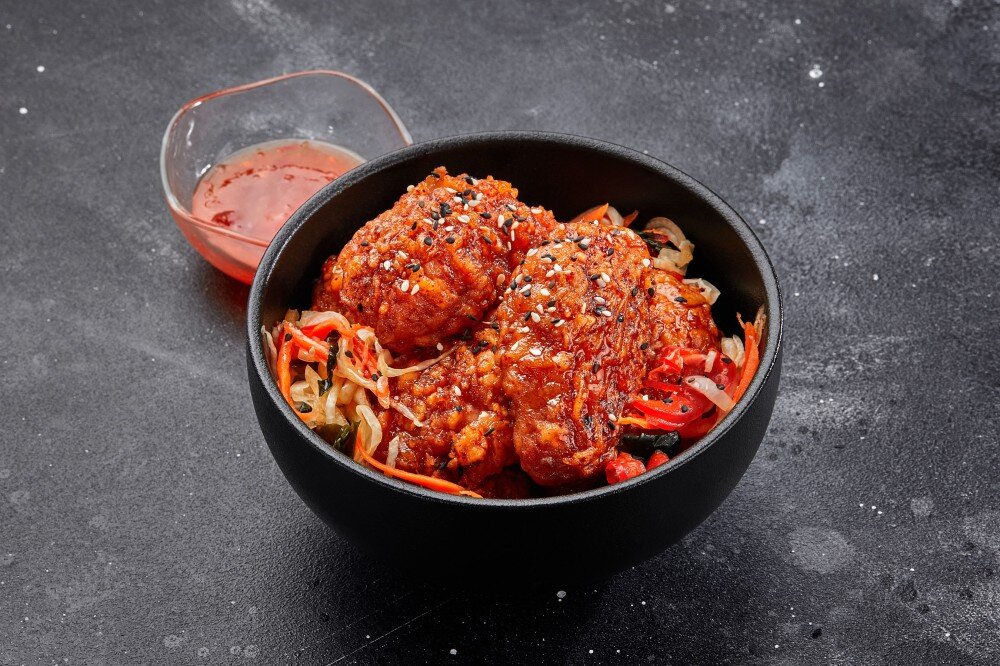 Куриные Крылья маринованные в соусе Шрирача, Темпурная Смесь, Глазурь для Крыльев, Овощи Микс, Вакаме, Масло Кунжутное, Кинза, Кунжут Подается со Сладким Соусом Чили