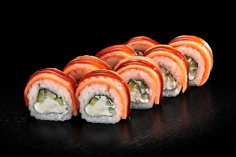 Рис, Нори, Лосось Филе Охлажденный, Крем Сыр, Огурец, Унаги Соус