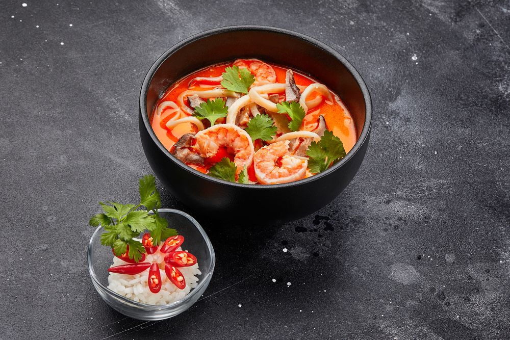 Бульон Том Ям, Тигровые Креветки, Кальмары, Грибы Шиитаке, Кокосовое Молоко, Сливки, Рис, Перец Чили, Кинза, Лист Кафир Лайма
