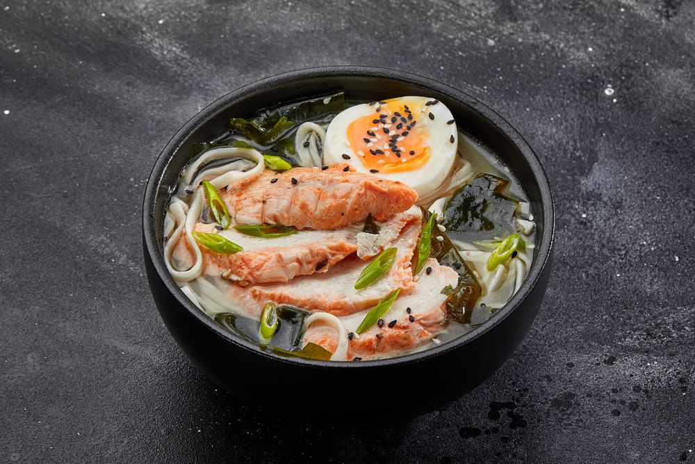 Бульон Куриный, Лапша Рамен, Филе Куриное Отварное, Водоросли Вакаме, Яйцо Куриное 1/2, Лук Зеленый, Кунжут