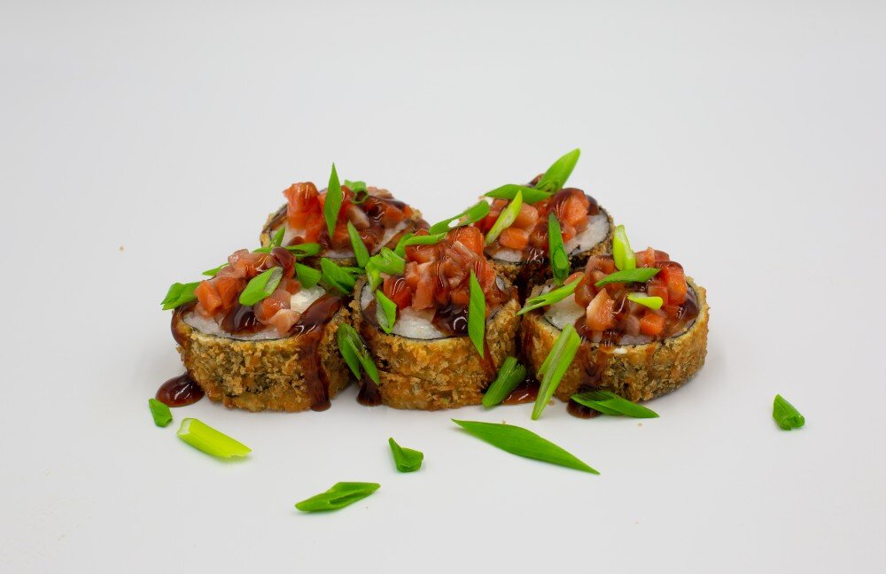Рис , нори , сыр сливочный , огурец , лосось тар тар , соус унаги , лук зеленый , кляр , сухари.