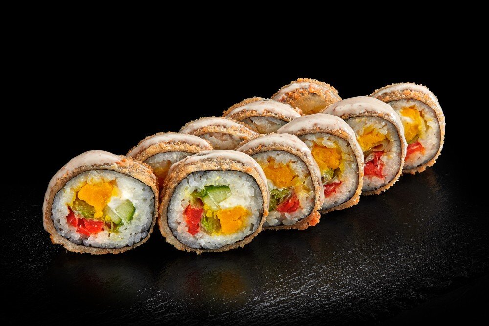Рис, Нори, Омлет Тамаго, Крем Сыр, Огурец, Салат Айсерг, Перец Болгарский, Ореховый Соус