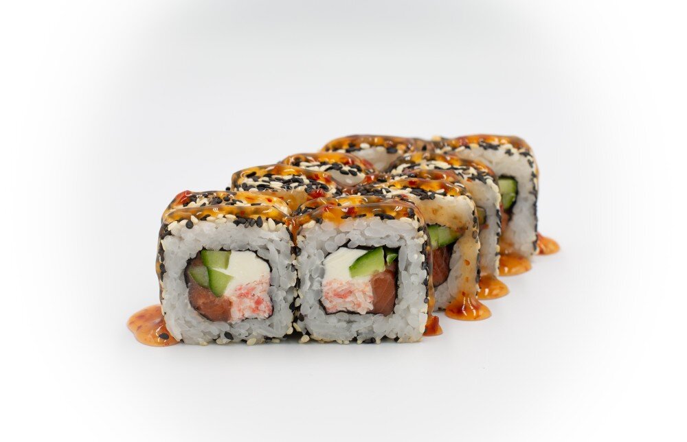 Рис, Нори, Лосось, Краб Микс, Крем Сыр, Кунжут, Огурец, Соус Сладкий Чили