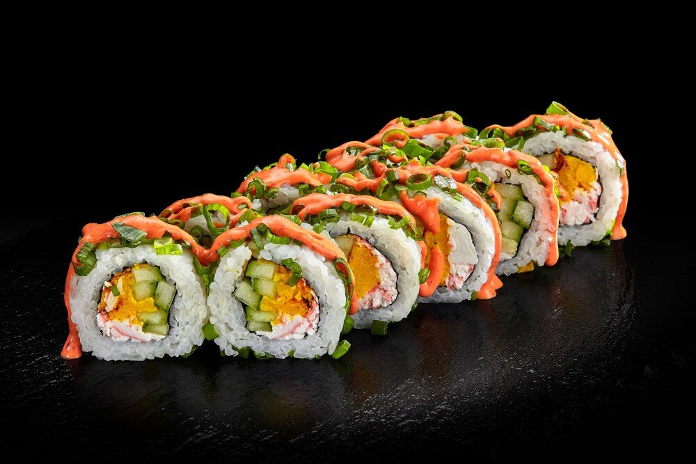 Рис, Нори, Краб Микс, Омлет Тамаго, Огурец, Лук Зеленый, Соус Спайси