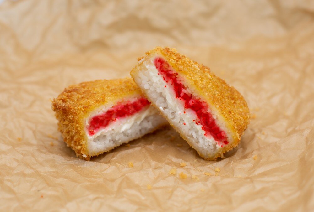 Креветка, сливочный сыр, красная икра масаго, рис, кляр, сухари панировочные