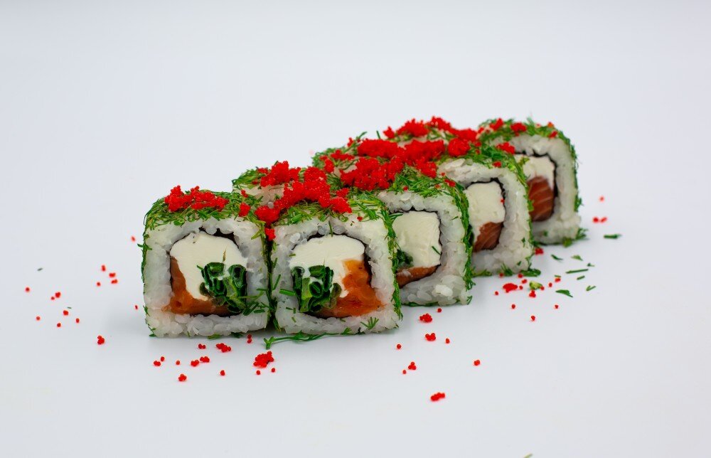 Рис, нори, крем сыр, лосось х/к, лук зеленый, укроп, икра масаго