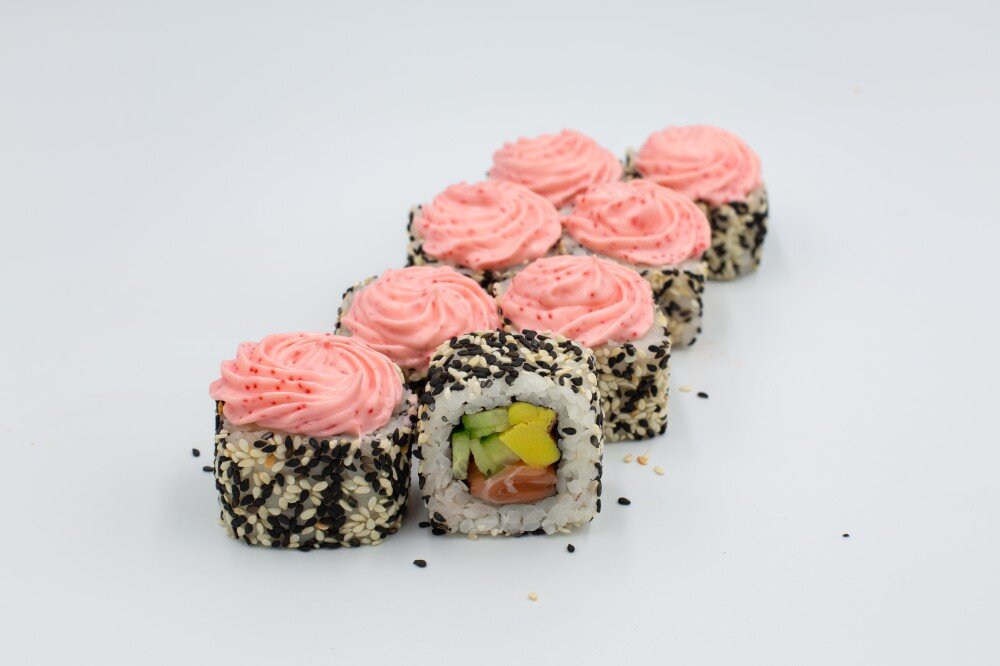 Рис, нори, омлет тамаго, огурец, лосось тар-тар, кунжут, соус лава